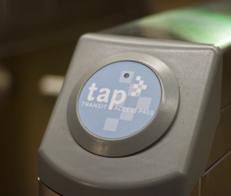 - To pass through the turnstile, hold your TAP card or phone over the TAP dial on the right side of the turnstile (see image below for what this looks like).